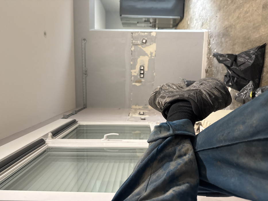 The scene depicts an interior space undergoing renovation in Lipsheim, France. The foreground shows the lower legs and feet of an individual, clad in soiled blue work trousers or overalls, black socks, and dirty, dark athletic shoes. One leg is bent at the knee, with the foot elevated towards the center of the frame. On the floor in the mid-ground, two black plastic trash bags are visible amidst scattered debris. The room's walls are partially stripped, revealing underlying plaster and gray paint, with several exposed electrical outlets and wiring cutouts. Gray surface-mounted electrical conduit runs along the upper perimeter of the walls. To the left, a white-framed window with horizontal blinds provides natural light. The ceiling is white and includes a single recessed light fixture. An open doorway on the right leads to an adjacent room where a large, stainless steel refrigerator/freezer unit is visible. The floor throughout the visible area is a dusty concrete surface.