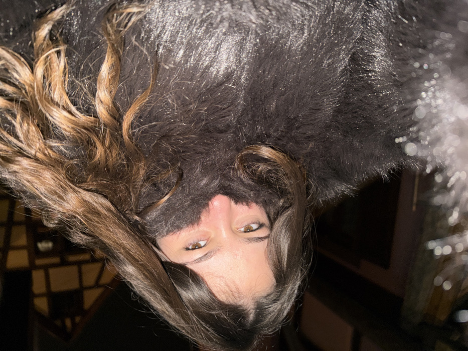 A person looks upside down at the camera. They have light brown eyes and long, brown hair, with some strands having blonde highlights. They are wearing a dark, furry coat or collar that surrounds their face, creating a contrasting texture against their skin and hair. The background is dark and partially visible, suggesting an indoor setting with vague shapes that could be furniture or architectural details.