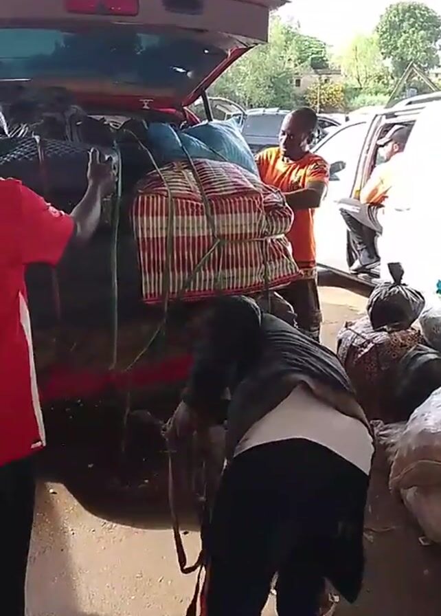 Several individuals are packing a red car with luggage. The car is stuffed with bags, blankets, and even spare tires. One man wears an orange t-shirt, another a red shirt. The men are using ropes and straps to secure the items. The scene appears to take place outside, possibly at a transport hub or parking lot, with other cars visible in the background.