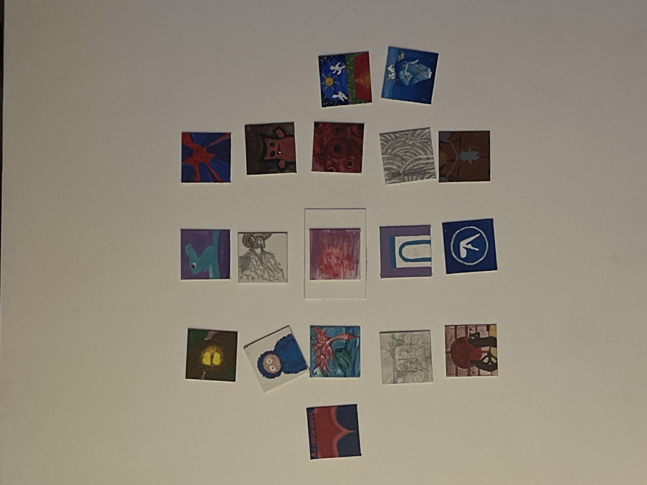 A collection of small, square paintings or drawings are arranged somewhat symmetrically on a white surface