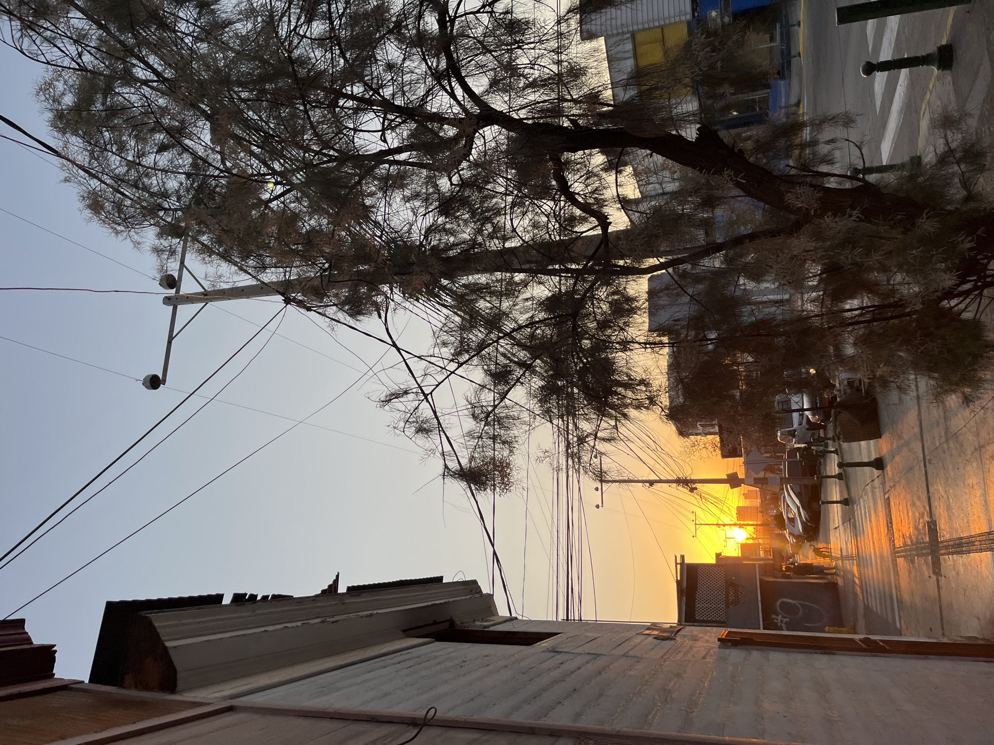 A street scene is captured at sunset. The sun is positioned at the end of the street, creating a silhouette effect on the buildings and trees. A tree with sparse foliage extends across the top portion of the frame, its branches reaching towards the sky. Power lines and poles are visible alongside the tree. In the foreground, a building with a corrugated metal roof is present. The street itself appears to be wet, with reflections of the sunset visible on the pavement. A crosswalk is visible in the distance, and there are parked cars and a few indistinct figures on the street. The location appears to be an urban environment, specifically a street in the city of Unknown, Unknown.