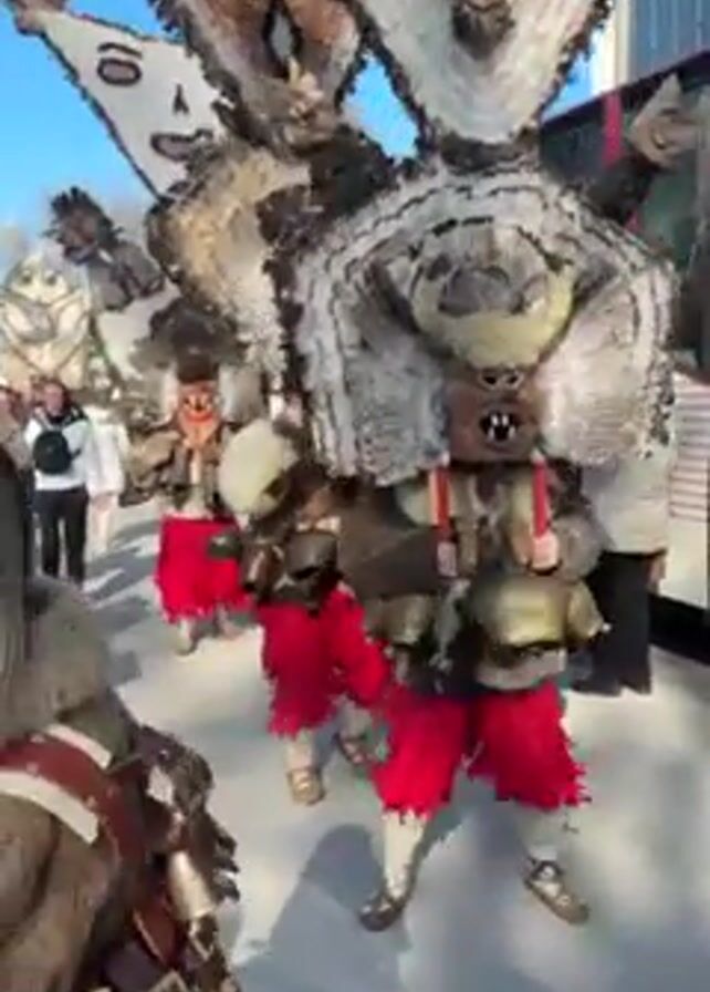 group of people dressed in elaborate traditional costumes, walking along a paved area on a sunny day. The costumes consist of large, ornate headpieces with geometric designs, animal-like masks, furry coverings on the upper bodies, and red fringed skirts. Bells are attached to the outfits, creating a ringing sound as the people move. Some of the headpieces are very large and appear to be constructed from feathers, wood, and other natural materials. The masked people are surrounded by onlookers who are taking photos and watching the procession. In the background, there's a building with large windows, a bus, and other people walking around, indicating a public event or festival.