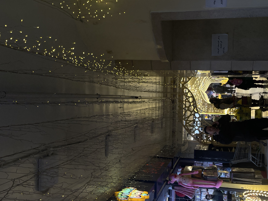 An indoor hallway is decorated with strings of tiny lights, creating a warm ambiance. People are walking through the area, and there are displays of merchandise along the sides. A large, ornate archway stands at the end of the hallway, adding to the decorative atmosphere. The image is rotated, causing a slight distortion in perspective.