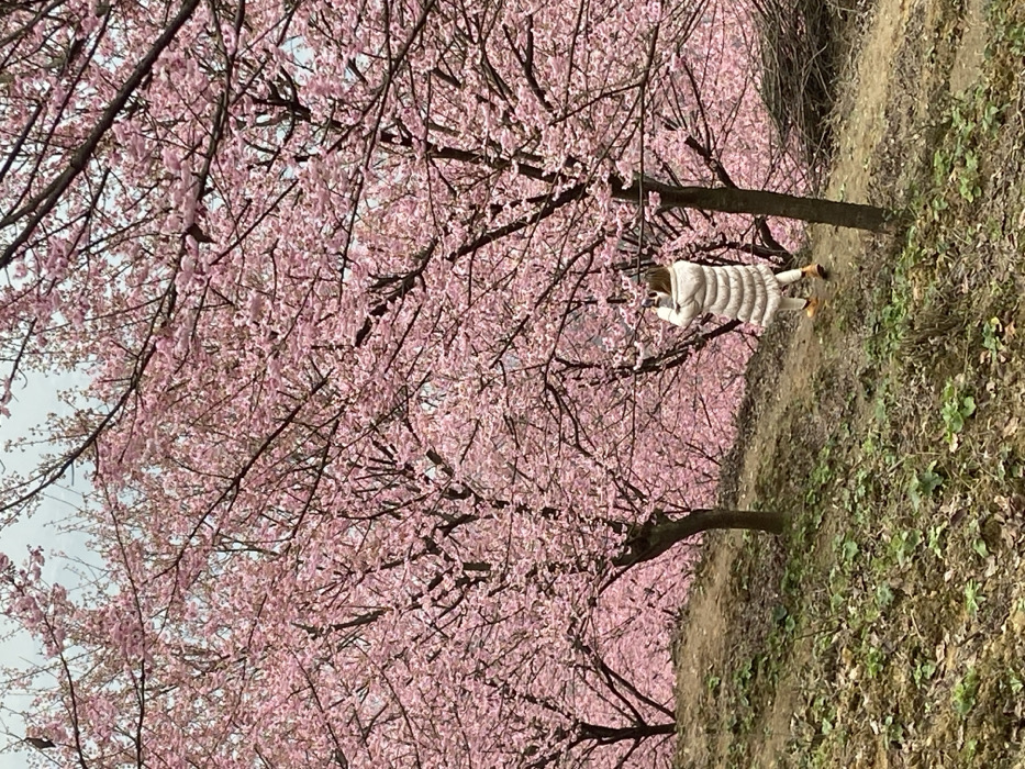 An individual in a white coat stands on a tree branch amidst a profusion of pink cherry blossoms. The trees, dense with flowers, form an alleyway. The person appears to be reaching into the blossoms. The ground beside the trees is covered with dried leaves and sparse vegetation. The photo is rotated, with the ground appearing on the right and the sky on the left.
