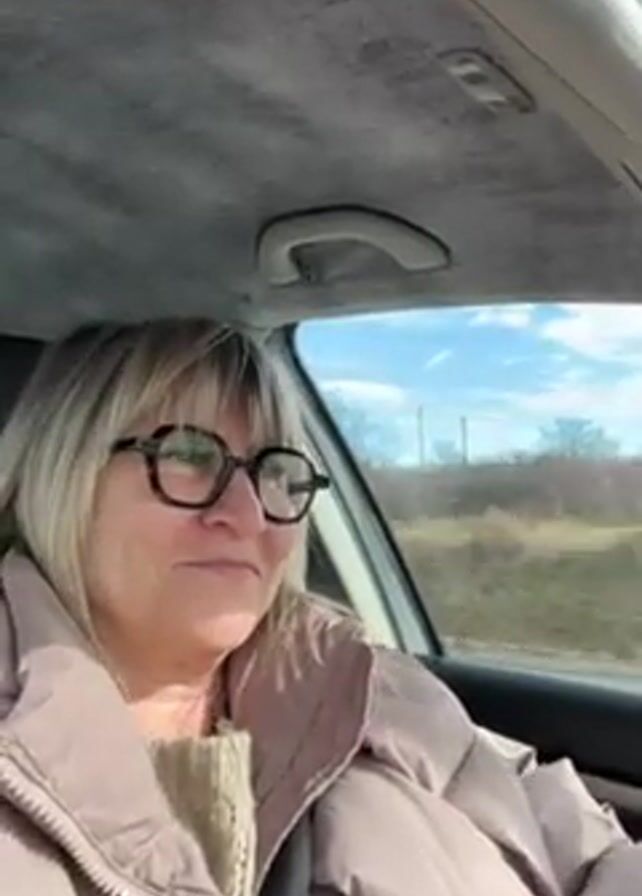 A woman with blonde hair and bangs, wearing large black-rimmed glasses and a light beige puffer jacket, is driving a car. She is looking forward with a slight, thoughtful expression. The background shows a rural landscape with bare trees and a blue sky with some clouds. The car's interior is visible, including the ceiling and a grab handle. The camera is positioned inside the car, capturing the woman's perspective as she drives.