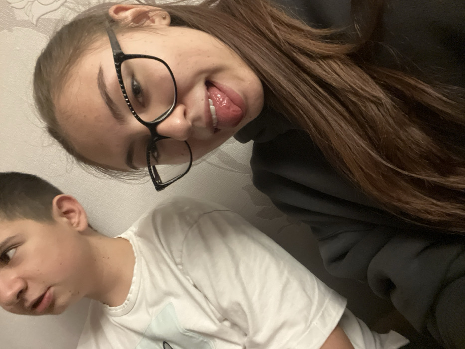 The image displays two young individuals in an indoor setting. In the foreground and right, a young female with long, straight, dark brown hair wears black-framed glasses with decorative accents. She looks towards the viewer, with her mouth open and tongue extended in a playful manner. She is dressed in a dark, long-sleeved garment, possibly a turtleneck or hoodie. To her upper left, partially visible, is a young male with short, dark hair, wearing a white t-shirt. He is looking upwards and to his left, away from the camera. The background consists of a light-colored wall with a subtle textured pattern. The scene provides no identifiable architectural or geographical markers to pinpoint a specific location within Sofia, Bulgaria; it depicts a generic interior space.