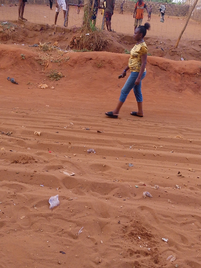 A woman walks along a dirt road littered with trash. She wears a patterned shirt, capri jeans, and sandals. In the background, other individuals are visible near a fenced area. The ground is mostly red dirt with tracks suggesting vehicle traffic. The scene appears to be an informal or less developed area.