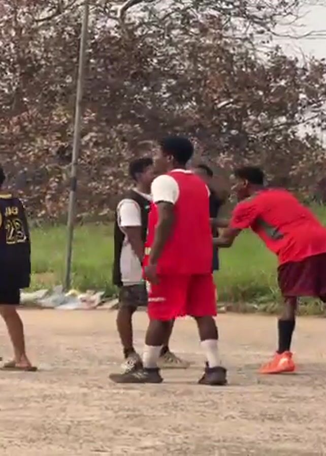 Four young men are on an outdoor basketball court. One is wearing a black jersey with the number 23 and the name "JAMES" on the back. Another is wearing a red jersey and shorts with black leggings on his arm. A third man is wearing a black and white jersey with the number 01 and camouflage shorts. A fourth man is wearing a red shirt and maroon shorts. The man in the red jersey is holding a basketball and appears to be giving instructions. The man in the 01 jersey is looking at him. A fifth man in a black t-shirt stands in the background. The background is trees and green foliage. The court is a dull dirt color.