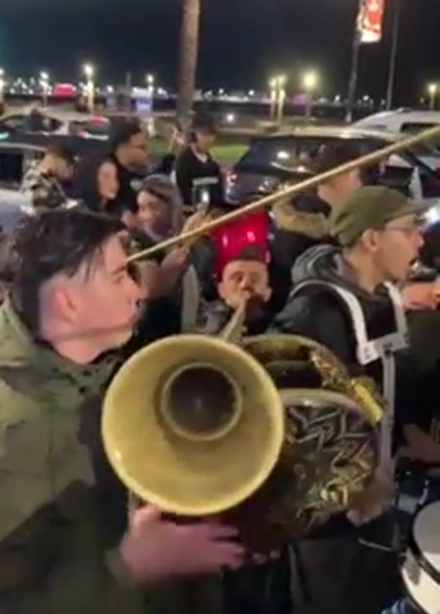 The video captures a lively outdoor gathering at night, possibly a celebration. A group of people is seen dancing and clapping, focused on a band in the foreground. The band appears to consist of young men playing large wind instruments and drums. One instrument is a decorated sousaphone. Some band members wear black vests with white harnesses. The surrounding area appears to be a parking lot with cars and streetlights illuminating the scene. Many people stand behind the band, enjoying the music. Some individuals are taking photos or videos with their phones. The mood is festive and energetic.