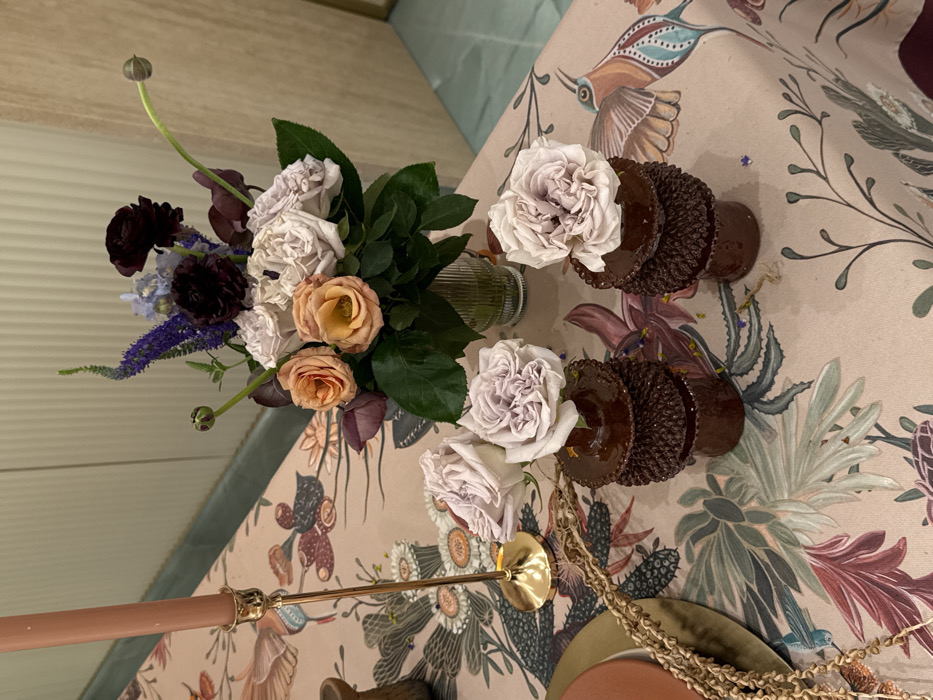 An overhead shot features a table adorned with a floral-patterned cloth. A vase containing dark purple and peach flowers, along with soft lavender roses, sits prominently. Three lavender roses are placed in front of a stack of intricately designed, dark brown decorative plates. A lamp with a gold base and salmon-colored pole is also visible on the table.
