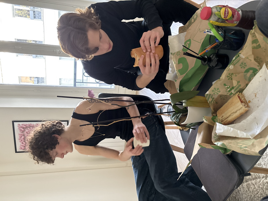The image depicts an indoor scene in a residential apartment in Paris, France, indicated by the characteristic Haussmannian architecture visible through the large window in the background. Two young males are present. The subject on the left, with curly brown hair, wears a black tank top and dark blue jeans. He is seated on a black chair, positioned with his body turned to the left, looking away from the camera. He holds a white mug in his left hand. A thin gold chain with a small pendant is visible around his neck. The subject on the right, with wavy brown hair, wears a long-sleeved black shirt and dark pants. He is in a crouched position over a dark coffee table, holding a partially eaten sandwich with both hands, indicating he is in the process of consuming it. The coffee table in the foreground contains meal items and accessories. A second partially eaten sandwich, unwrapped from paper, rests on the table. Two brown paper bags, featuring green snowflake and recycle symbol motifs, are present; one is flattened, the other contains wrappers. A clear plastic bottle of Lipton Iced Tea (Framboise flavor) with a red cap is on the table, alongside a black mesh cup holding various pens and markers (green, blue, yellow, black), a small black reed diffuser with black sticks, and a dark grey laptop sleeve. A potted orchid plant, with green leaves and a bare stem displaying a small purple bud and some withered sections, is also on the table, positioned between the two individuals. The room features white walls and a light-colored carpet or rug. A framed artwork showcasing pink, organic shapes hangs on the wall to the left. The window reveals a bright exterior with multi-story, light-colored stone buildings, distinct wrought-iron balcony railings, and multiple windows, typical of Parisian urban design. No direct interaction between the two subjects is observable.