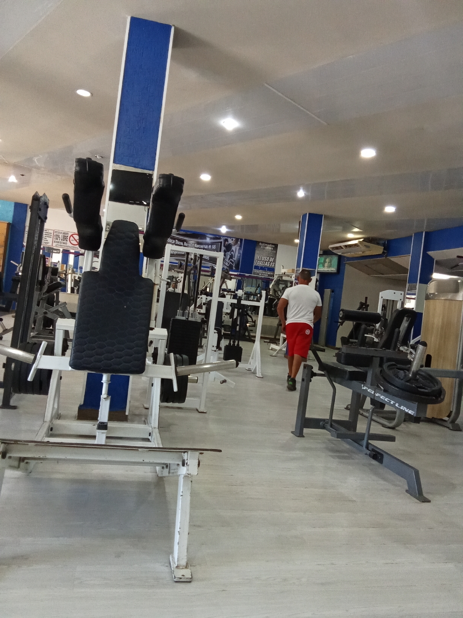 interior of a gym, presumably in Juan Griego, Venezuela. The setting appears to be a weight room with several pieces of exercise equipment arranged throughout the space. In the foreground, there is a leg press machine with black padding and white frame. Further into the gym, a man wearing a white t-shirt and red shorts is walking away from the camera. The gym's color scheme is predominantly blue and white. There's a sign visible, partly obscured, and it contains text related to gym policies. A television is mounted on the wall in the background. The floor is a light, neutral color, and the overall lighting in the gym is bright. The gym is filled with various weight machines and equipment, typical of a fitness center.