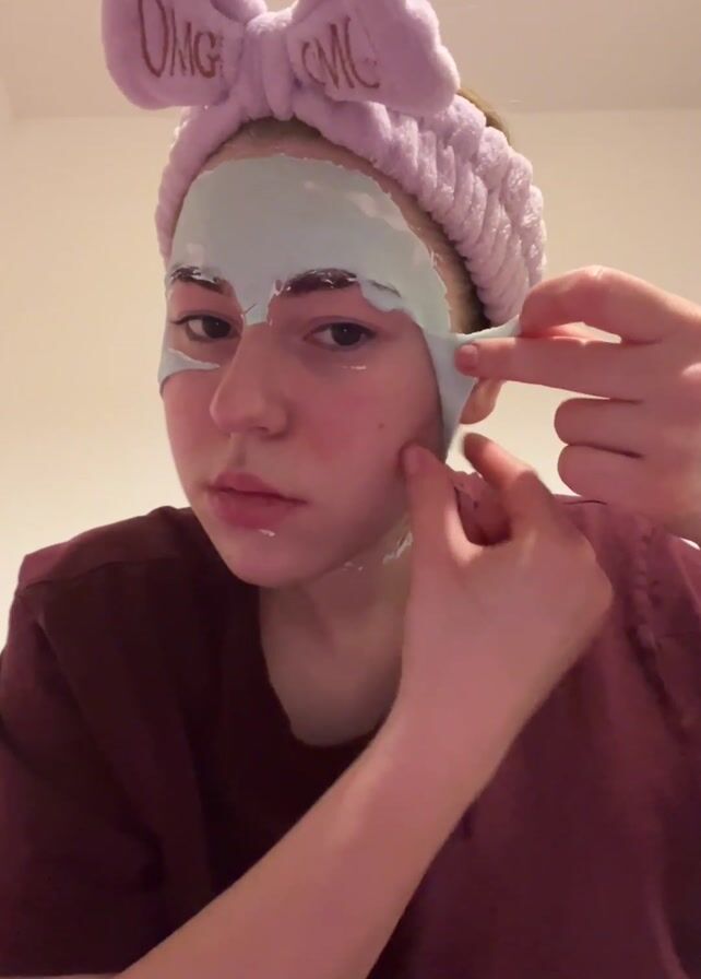 - "A young person wearing a maroon shirt and a lavender headband with "OMG" written on it is peeling a light green facial mask off their face" by FM-CMDbi2, licensed under CC BY 4.0