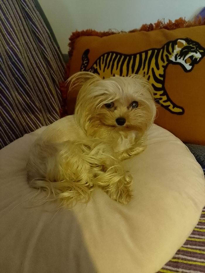 - "A small, light brown dog with long hair sits on a large, cream-colored pillow" by FM-5n8Vg2, licensed under CC BY 4.0