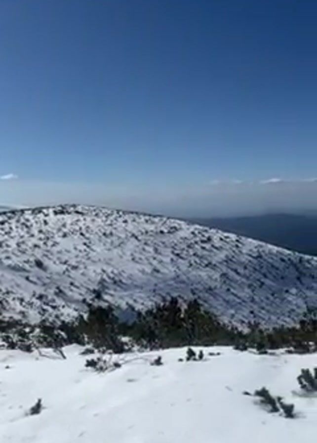 snowy mountain landscape under a clear blue sky. There are small, dark green pine trees scattered across the snow-covered ground. The camera pans slowly to the right, revealing a distant valley or plain below, partly obscured by haze. Another mountain range is visible in the far distance.