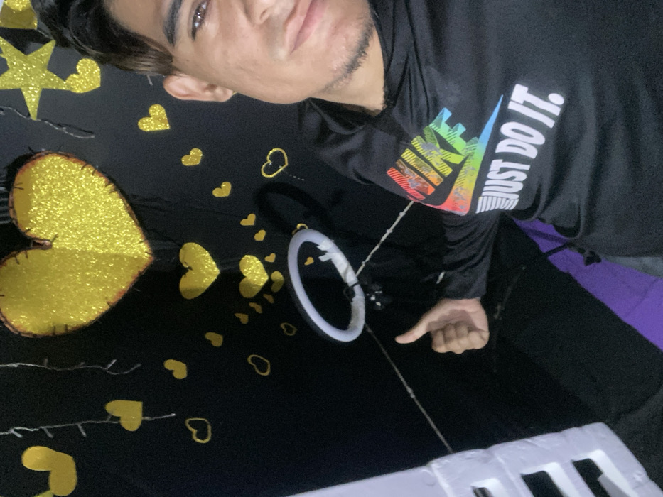 An upward-angled, close-up photograph depicts a young adult male positioned on the right side, against a black decorative backdrop in an indoor setting in Juan Griego, Venezuela. The male has short dark hair, dark eyes, and minimal facial stubble, looking directly at the camera with a slight smile. He wears a black long-sleeved hooded shirt featuring a multicolored "NIKE" logo and "JUST DO IT." slogan on the chest. His right hand is raised, performing a "thumbs up" gesture. The black background is adorned with numerous yellow heart shapes of varying sizes, some solid glitter and some outlined. A large, prominent yellow glitter heart is visible at the top-center left, and a yellow glitter star is in the top-right corner. Thin string lights with small white bulbs descend vertically in parts of the background. A white illuminated LED ring light is suspended in the mid-ground, centered left of the male. A section of a white slatted object is visible along the far left edge, and a purple surface is partially visible at the bottom.