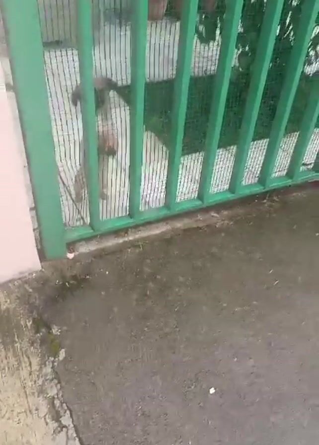The camera zooms in on a small, brown, long-haired dog barking behind a green fence. The fence has vertical metal bars and is covered with square mesh wire. Behind the fence is a tiled patio with green plants and potted red flowers. The ground in front of the fence is damp pavement. The dog is standing on its hind legs, bracing against the fence as it barks.