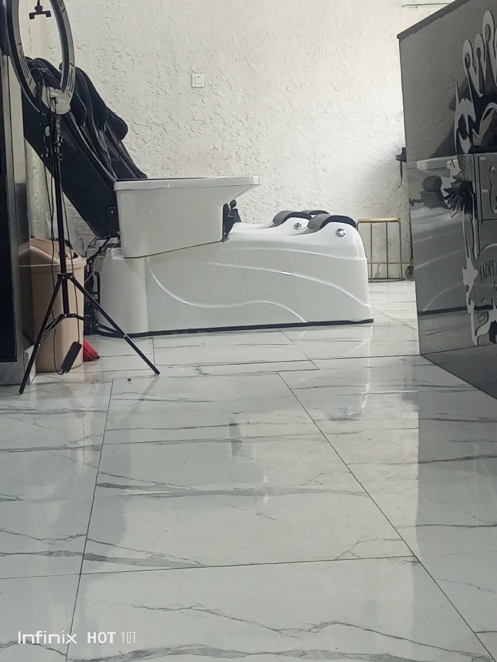 The image displays the interior of a facility, likely a beauty salon or spa. The specific location within Abuja, Nigeria, is not visually identifiable from the provided image. The scene is dominated by a clean, white, and reflective environment. The floor is covered with large, polished white tiles featuring subtle gray veining. In the central midground, a modern white pedicure station is prominent. It features a raised, rectangular basin section at the rear, followed by a contoured lower section with two integrated black footrests and chrome accents. Behind the pedicure station, to the left, a black tripod stand extends upward, supporting a partially visible circular ring light positioned out of frame at the top left. A light brown waste bin is situated behind the tripod stand. The background consists of a light-colored, textured wall, possibly stucco or painted, on which a white electrical outlet is mounted. To the far right, a tall, reflective surface, possibly a mirror or polished metal panel, reflects elements of the room and features a black and white decorative design in its upper portion. Further in the background, to the right, a small, metallic, grid-like object, possibly a storage cart or frame, is partially visible. No individuals are present, and no actions or interactions are depicted. The overall lighting is bright, suggesting an interior space during daylight hours or under artificial illumination. The bottom left corner of the image contains a watermark: "Infinix HOT 10T".