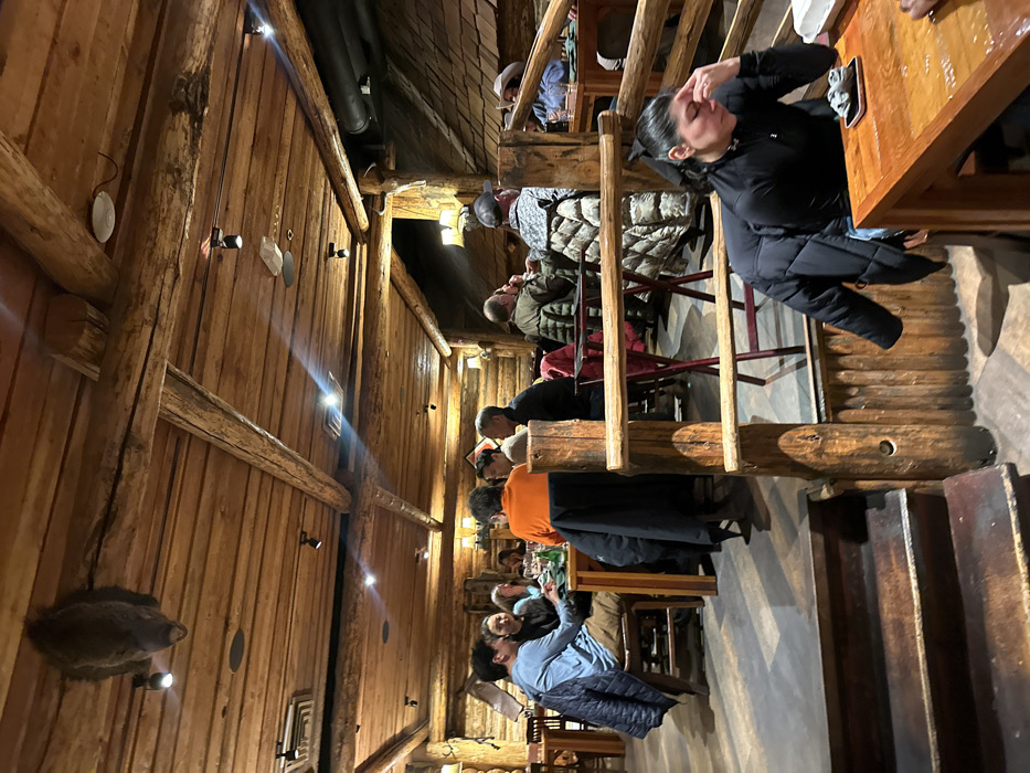 The image captures an interior view of a rustic, log-cabin-style restaurant. Diners are seated at wooden tables on multiple levels, separated by log railings. The walls are made of rough-hewn logs, adorned with mounted animal heads and sconce lighting. Overhead, dark piping runs along the ceiling. The atmosphere is warm and inviting, with a mix of patrons enjoying their meals and conversations.