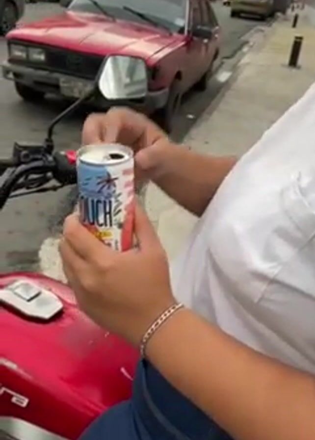 A young woman is sitting on a red motorcycle on a city street. She is wearing a white t-shirt and blue jeans. She opens a can of "LOVOCH SPRITZ" and takes a drink from it. She laughs at some point during this. There are cars parked on the street and buildings in the background.