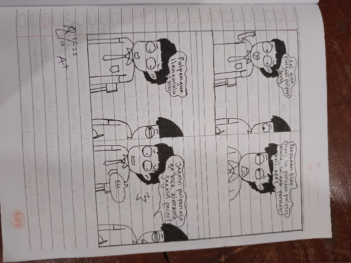 The image displays a photograph of a hand-drawn, four-panel comic strip rendered in black ink on a piece of white, blue-lined notebook paper
