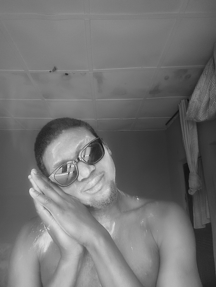 A black and white portrait shows a bare-chested man wearing sunglasses with his hands clasped next to his face in a resting position. He appears to have powder or lotion on his face and shoulders. The background includes a textured ceiling and a curtain hanging to the right. The lighting suggests a window on the right side of the image.