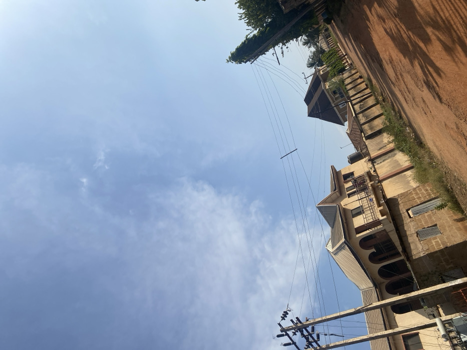 The image captures an unpaved, reddish-brown dirt road in Sabon Tasha, Nigeria, under a clear blue sky exhibiting scattered wispy clouds
