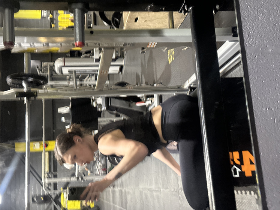This image depicts an indoor gym environment, specifically identified as PureGym Tunbridge Wells, United Kingdom, based on the distinctive yellow and black branding and "GYM" logo visible on the dark grey rubber flooring. The primary subject is a female individual captured in a mirror selfie. She is seated on a black plyometric box, which has partially visible orange and white lettering on its side. Her body is angled, and she is looking towards her left, holding a dark-colored smartphone with a visible multi-lens camera array in her left hand to take the photograph of her reflection. She is wearing a black tank top that exposes her midriff and black athletic leggings. Her brown hair is pulled back into a bun. A faint tattoo is visible on her left forearm, and a small white object is present in her mouth. The background, visible through the mirror, features various gym equipment. Immediately behind the subject is a silver squat rack or Smith machine with a barbell and a single black weight plate loaded on one side. Further back, additional weight machines, including one with a prominent silver and red design, are visible. Yellow structural columns and further yellow branding elements are scattered throughout the background. A light-colored wooden crate is present on the right side of the frame near the squat rack. The gym is well-lit by overhead artificial lighting.