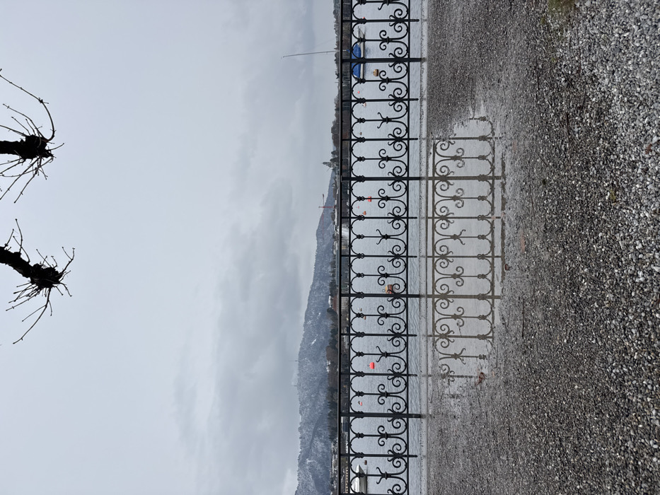 The image depicts a static scene on the promenade along Lake Zurich in Zurich, Switzerland, under an overcast sky. In the immediate foreground, a dark grey gravel path is visible, with a prominent, irregular puddle reflecting a black wrought-iron railing. The railing, featuring decorative scrollwork patterns, extends horizontally across the mid-ground, acting as a barrier between the path and Lake Zurich. The lake's surface is calm and dark grey. At least six spherical orange buoys are present on the water. Towards the right, a white sailboat, covered by a blue tarp, is moored, with its mast clearly visible. The distant shore reveals buildings and structures, including a red construction crane towards the right. Behind the far shore, snow-covered hills and mountains rise under the cloudy sky; a distinct telecommunication tower is visible atop the leftmost snow-covered peak, identifiable as Uetliberg. Bare, dark, gnarled tree branches extend downwards into the top portion of the frame from an unseen tree. No individuals are present in the scene. The overall environment suggests a cold, possibly winter or early spring day.