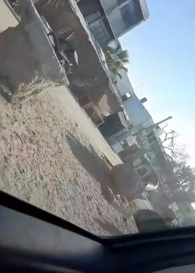 The video is taken from inside a car driving down a street. The street is unpaved and sandy. There are buildings on the side of the road, some with tarps or makeshift shelters attached. A large rock is seen on the side of the road. A person on a bicycle passes by. The sky is blue and clear.