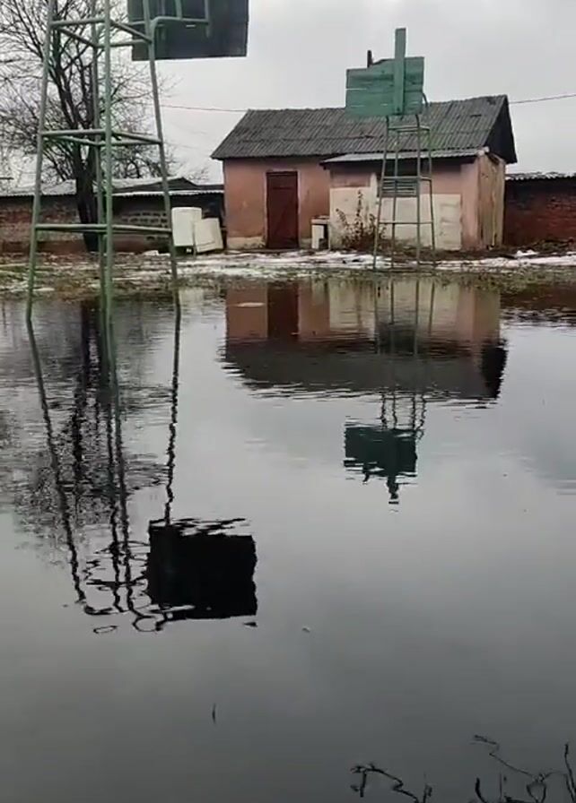 The scene presents a flooded outdoor basketball court. Two basketball hoops stand partially submerged in the water, their metal frames and backboards reflecting on the dark surface of the floodwater. Behind the basketball hoops, there's a small, pink-walled building with a gray roof. A brick wall runs along the periphery of the area, with patches of snow visible in places. The sky is overcast and gray. A leafless tree stands near the left basketball hoop, its branches adding to the somber atmosphere.