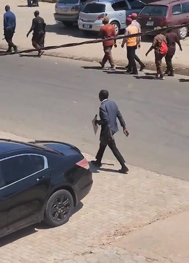 street scene during the day with several people walking. Several people, some in brown uniforms and others in orange vests, carry a long metal pole across the street. A man in a grey suit walks in the opposite direction. Several cars are parked along the side of the road. The street is paved with asphalt and there is a brick walkway adjacent to the road. There are buildings visible in the background.