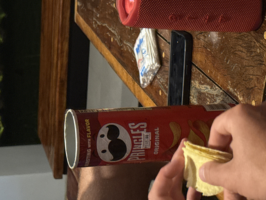The image depicts an indoor scene in General Luna, Philippines, focused on a wooden table. In the center, an open, red Pringles can of "Original" flavor is visible, displaying a price tag marked "P148.00". A pair of hands in the lower left foreground is holding a stack of several yellow potato crisps, consistent with Pringles, suggesting the individual is either removing them from the can or preparing to eat them. To the right of the Pringles can, a clear plastic packet containing multiple white cotton swabs is present. Below the cotton swabs, a black smartphone lies face down. Further to the right, a red, cylindrical object with a textured, mesh-like surface, resembling a portable speaker, is partially visible. The table surface is dark-stained wood, exhibiting distinct grain patterns. In the background, a dark wooden surface, possibly a shelf or another table, is seen against an indistinct, dark backdrop.