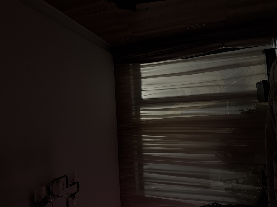 The image depicts a dimly lit interior room within the city of Sofia, Bulgaria. A large window, the dominant feature, is centrally positioned and covered by translucent, light-colored sheer curtains, through which diffused external light filters into the room. A multi-bulb ceiling light fixture, dark and appearing unlit, is visible on the upper-left ceiling. Behind the left portion of the sheer curtains, the faint outlines of several potted plants are discernible on a windowsill or ledge. To the right of the window, a dark, heavy drape or wardrobe panel covers a section of the wall. In the lower-center foreground, a dark, indistinct object, possibly a cushion or bag, rests on a low surface. The room is characterized by low light conditions, with no individuals, specific actions, or direct interactions visible.