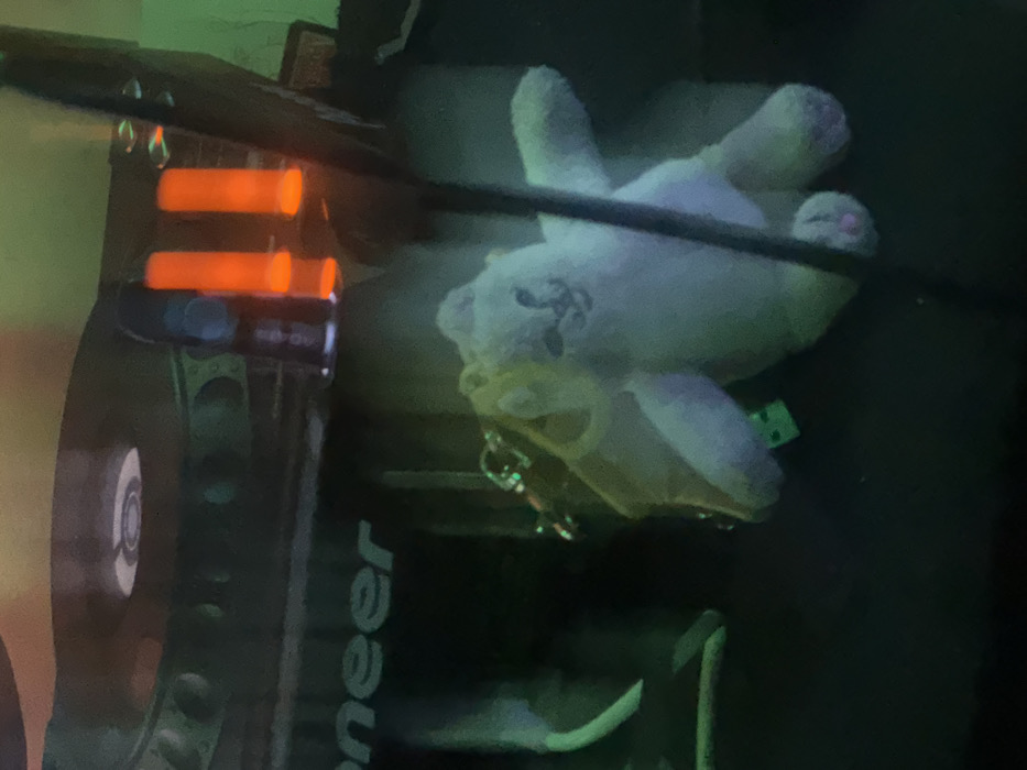 The image depicts a low-light indoor scene, likely a DJ booth or performance area within a venue in Mexico City, Mexico. In the upper left quadrant, a portion of a black Pioneer-branded DJ controller or turntable is visible, featuring a circular platter. To its right, two vertical, glowing orange-red light tubes or indicators are present, positioned above a dark component. Below the DJ equipment, a light-colored, possibly white, plush toy resembling a cat or small animal is centrally positioned. The plush toy has an embroidered face and appears to be suspended or resting, with its limbs splayed. A metallic keyring attachment is visible near its head, and a small, green-glowing object, consistent with a USB flash drive, is attached to or near the toy. The overall lighting is dim, characterized by green ambient light in the foreground and the prominent orange-red lights on the equipment. A dark vertical element partially obscures the right side of the frame. No individuals are visible.