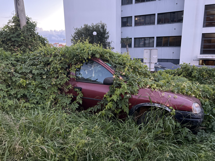 A maroon car is almost completely covered in thick green vines and tall grass, obscuring most of its form. Only the front windshield and partial hood are visible. The surrounding environment includes a utility pole with similar vine growth, and a modern white building with windows in the background. The scene evokes a sense of nature reclaiming abandoned objects in an urban setting.