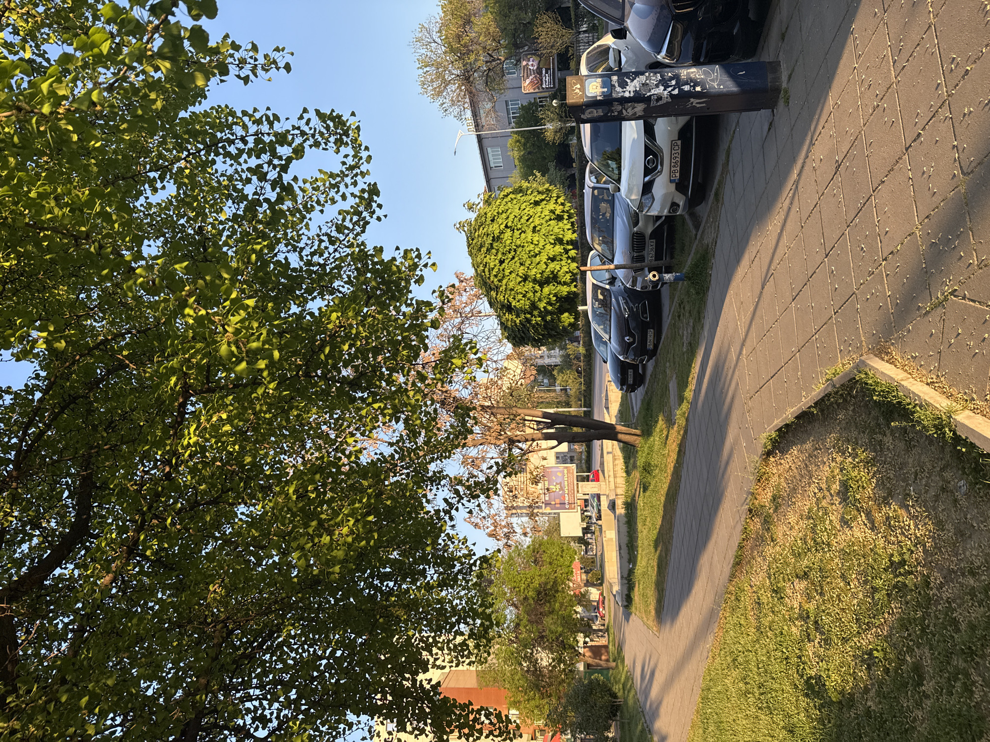 street scene in Plovdiv, Bulgaria. The camera appears to be at street level, angled upwards. A large tree with dense green foliage dominates the left side of the frame. A sidewalk runs along the right side, bordered by a grassy area. Several cars are parked along the sidewalk on the other side. A sign is present near the cars. In the background, a building is visible, with other trees and vegetation. The sky is clear and blue. The overall impression is a quiet, residential street scene on a sunny day. The car plate number of a white car parked at the side of the street is "PB 8693 CP".