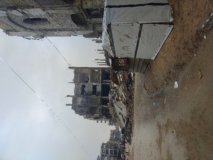 The image depicts a street scene in Khan Yunis, Palestinian Territory, characterized by extensive urban destruction under an overcast sky. In the foreground, a dirty, unpaved or heavily worn road shows scattered debris including plastic bottles and wrappers. To the immediate right, a makeshift structure is visible, constructed from corrugated metal panels and white tarpaulin, with faint markings or Arabic script on its fabric surface. The midground is dominated by a substantial mound of rubble, concrete, and twisted rebar, indicative of a collapsed multi-story building. Behind this debris pile, the heavily damaged concrete skeleton of another multi-story building stands, featuring large voids where walls and floors once existed, and exposed structural elements. Further into the midground and left background, additional severely damaged buildings, some partially collapsed, extend along the street. A few indistinct human figures are visible walking in the distance near these structures on the left. On the far right, a tall, multi-story building with a concrete facade is prominently featured, exhibiting significant damage, including shattered windows, exposed interiors, and distinctive arched window openings on its upper floors. Utility wires crisscross the sky above the devastated landscape, connecting between the remaining structures. The scene conveys widespread structural damage and urban decay.