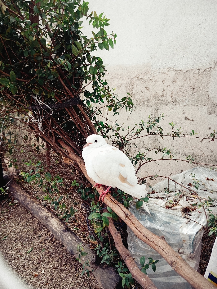 - "An all-white pigeon, exhibiting subtle light brown or tan patches on its wings, is perched centrally on a horizontal, light-brown natural tree branch" by FM-dAXDx2, licensed under CC BY 4.0