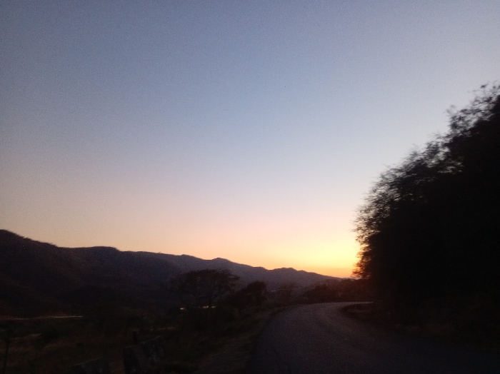 The image displays a landscape scene in Sabaneta, Venezuela, during twilight, characterized by the transition from light blue in the upper sky to a pale orange-yellow gradient at the horizon. A dark, paved road curves from the lower-right foreground towards the center-left midground. The right side of the foreground and midground is dominated by a large, dark mass of foliage, likely trees or dense bushes, heavily silhouetted. In the midground and background, a series of dark, undulating mountains or hills are visible, silhouetted against the lighter sky. The overall lighting suggests either dawn or dusk, with deep shadows obscuring detail in the terrestrial elements. No individuals, vehicles, or structures are discernible.