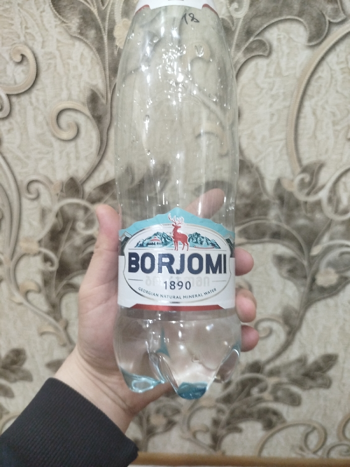 The image displays an indoor scene in Bukhara, Uzbekistan. A single light-skinned human hand, wearing a dark-colored long-sleeved garment with a ribbed cuff, holds a clear plastic bottle vertically in the foreground. The bottle is largely empty, containing minimal liquid residue at the bottom and some internal condensation. The label on the bottle is white, with blue and red accents, prominently displaying "BORJOMI" in blue capital letters, along with "1890" and "GEORGIAN NATURAL MINERAL WATER." A graphic of a red deer against a mountain backdrop is central to the label design. A handwritten "18" is marked in black on the upper portion of the bottle's plastic body. The background consists of a wall covered in wallpaper featuring a repeating pattern of ornate, swirling motifs in shades of beige and light brown. A narrow, light brown horizontal strip, possibly a decorative trim, is visible at the very bottom of the frame.