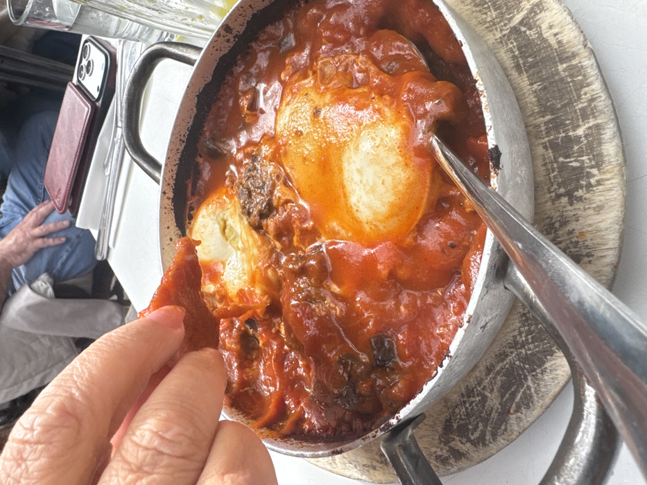 The scene depicts a close-up, elevated view of a shakshuka dish served in a metal pan on a round, distressed wooden cutting board, positioned on a white tabletop within a restaurant or cafe in Tel-Aviv, Israel