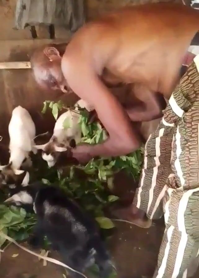 A partially clothed, dark-skinned man feeds a group of goats in a penned area. The man is bald and wearing a patterned garment around his waist. He is barefoot and bent over, distributing a pile of green leaves to the goats. There are five goats visible, with varying colors, including black, white, and brown. The pen appears to be constructed from wood and has a dirt floor. There's a white container and cloth visible above the pen.