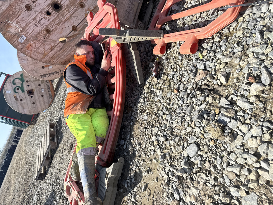 In Ballyboughal, Ireland, an outdoor scene on a gravel and dirt surface depicts a male individual, appearing to be asleep or resting, lying prone on a red plastic construction barrier