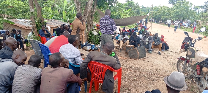 The image depicts an outdoor community gathering in Namisha, Democratic Republic of the Congo