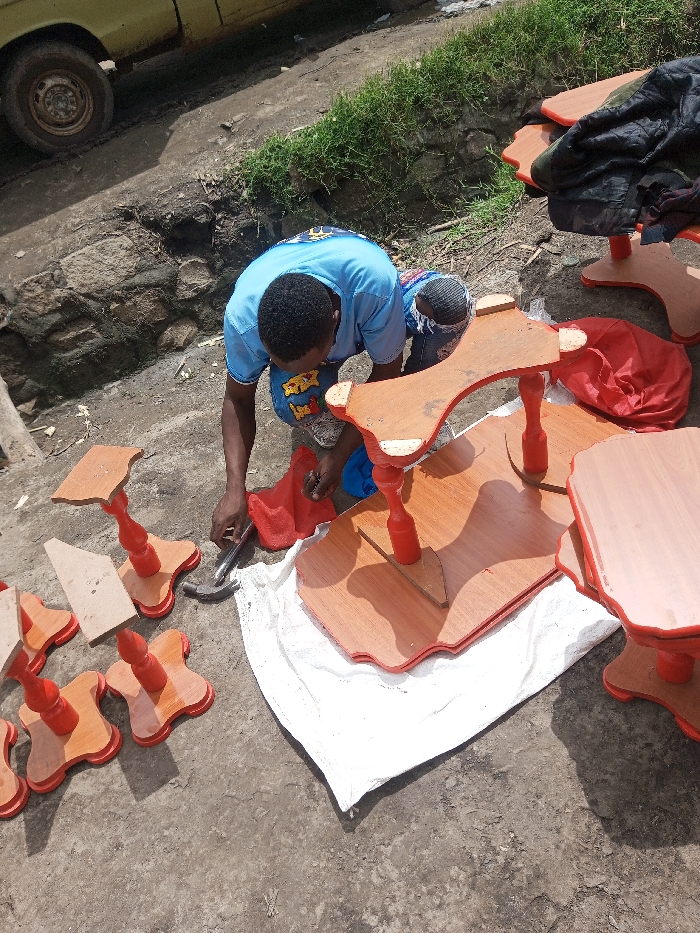 The image depicts an outdoor furniture assembly and repair scene in Matungulu west ward, Kenya