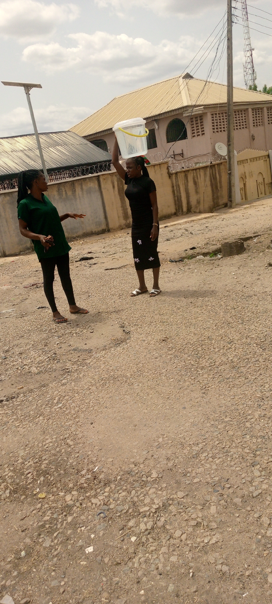 In Adankolo, Nigeria, two women stand on a gravel road. One woman, dressed in a black dress with white flower details, balances a white bucket on her head. The other woman is wearing a green top and black leggings. The background shows buildings with a beige or light pink hue, along with fences topped with barbed wire. A solar street light is visible to the left. The sky is overcast.