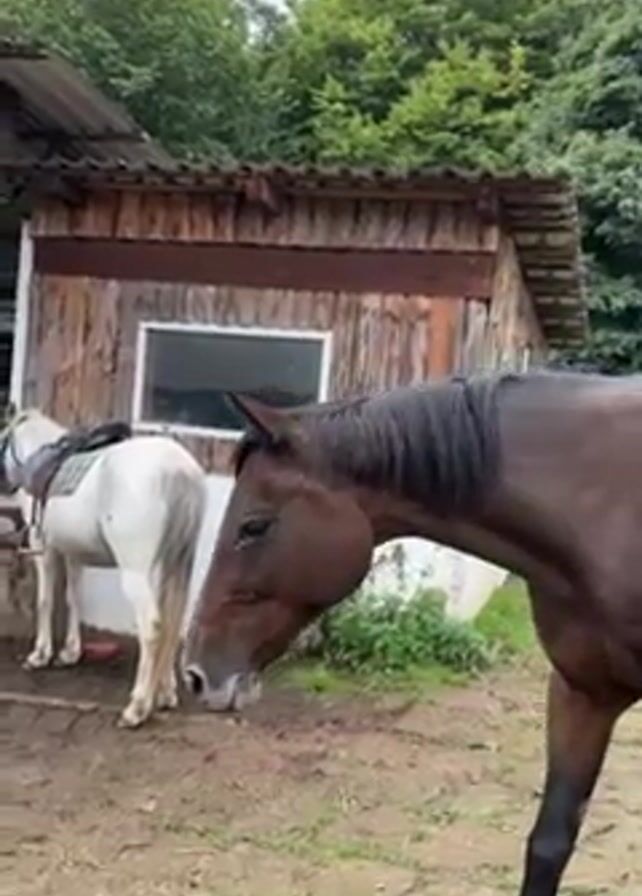 two horses standing in a muddy, grassy area next to a small wooden structure. One horse is brown with a black mane, standing in the foreground, with its head lowered slightly. The other horse is white and standing near the wooden structure, saddled and ready for riding. The structure appears to be a small shed or stable, with a window and walls made of rough-hewn wood. Dense green trees can be seen in the background, suggesting a rural or wooded environment. The sky is overcast.