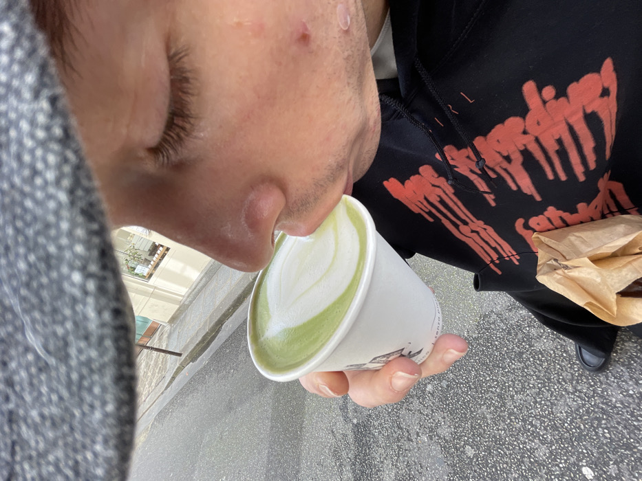A close-up, high-angle street-level image captures a male individual drinking from a white paper cup on a damp urban street in Paris, France. The person's face is partially visible from the nose down, with their right eye closed. They wear a grey, textured flat cap, a black hoodie featuring faded orange/red abstract or skeletal-like graphics, black trousers, and a dark slip-on shoe. Stubble is present on the chin and jawline, and minor blemishes are visible on the right cheek. The individual holds a white paper cup with both hands, the rim positioned at the lips, containing a green beverage with white latte art forming a leaf or heart pattern. Indistinct dark text, including "senza glutine" and "biologico," is visible on the cup's side. A crumpled brown paper bag rests on the person's lap. The background shows a wet asphalt street and curb, a slender dark pole, and a light-colored building with large windows, indicating a commercial establishment.