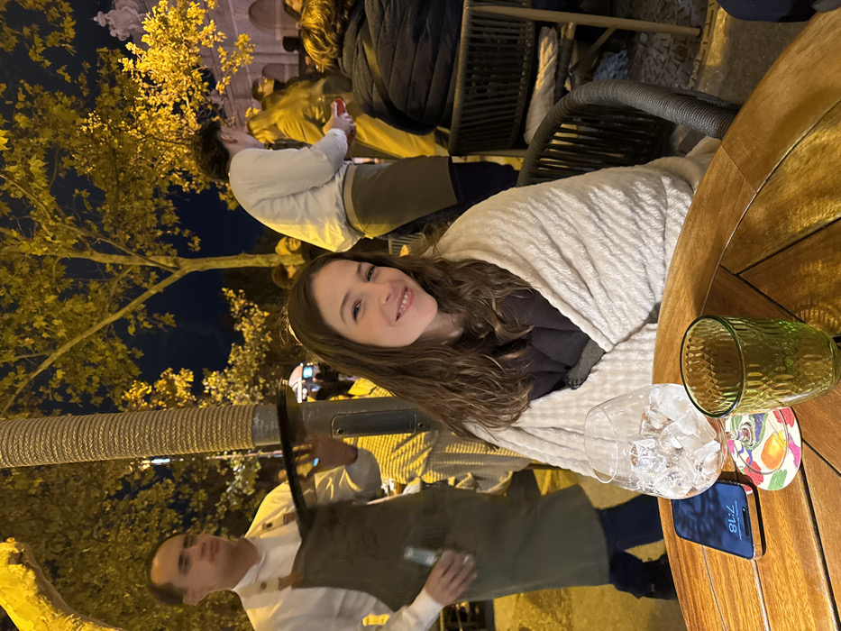 A woman smiles, wrapped in a blanket at an outdoor table. A partially visible server wearing an apron stands nearby. On the table are a green glass, a glass filled with ice, a colorful coaster, and a phone displaying the time as 7:18. Other people sit behind her. Trees with yellow leaves and a dark sky are in the background.